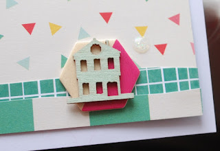 You get a full pack of the new Pink Paislee Take Me Away veneer embellishments. These ones have painted details. I liked these from the Take Me Away collection as the collection as a whole is very femanine but thse veneers have lovely bright pops of colour that will work with so many themes and especailly good for documenting the summer months. You also get these cute little house wooden embellishments in a minty green. There is some minty green matching pom pom trim in the kit and it's only when I'm looking back through these photos I've noticed I've not got that here but you can see it on the
